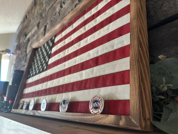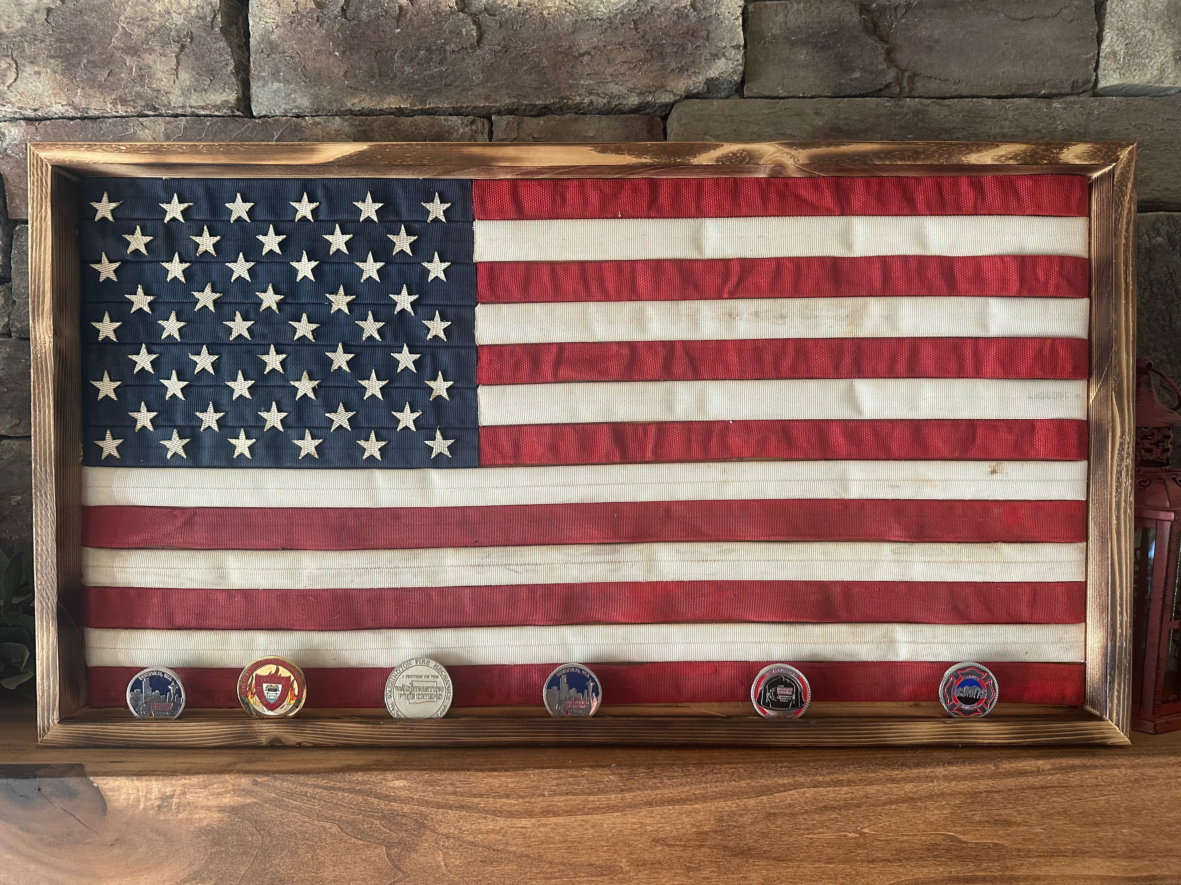 The solid cedar frame is designed with a built-in cutout to proudly display your challenge coins (coins not included). Whether hung in a home, office, firehouse, garage, or man cave, this fire hose flag serves as both powerful wall art and a meaningful keepsake.